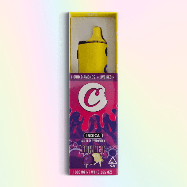 Disposable 1ml vape pen filled with premium Cookie Sorbet indica strain concentrate.